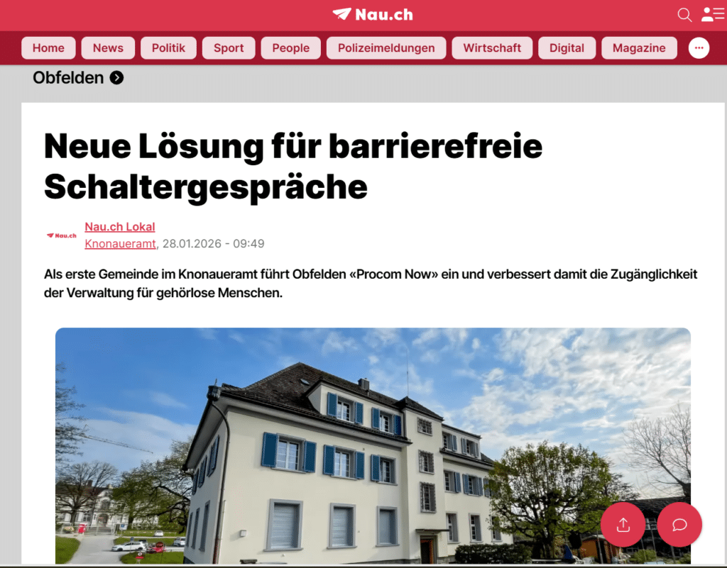 Als erste Gemeinde im Knonaueramt setzt Obfelden PROCOM NOW ein. Die Gemeinde ermöglicht damit barrierefreie Schaltergespräche für gehörlose Menschen. Über dieses Engagement hat auch Nau.ch berichtet. (zum Artikel: Neue Lösung für barrierefreie Schaltergespräche | Nau.ch)