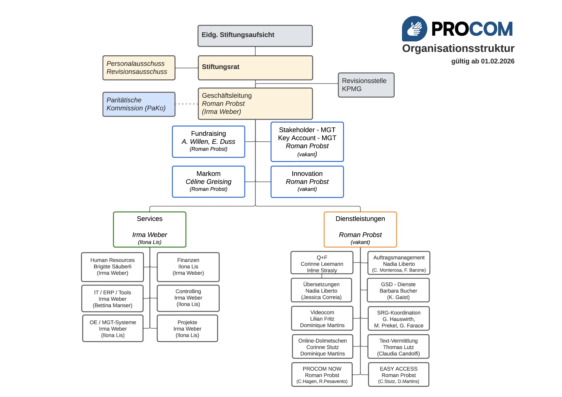 PROCOM Organisation – Geschäftsleitung, Stiftungsrat, Team Olten, Team Lausanne, Auftragsmanagement Olten, Auftragsmanagement Lausanne, Dolmetscherinnen DSGS, Dolmetscherinnen LIS, Dolmetscherinnen LSF